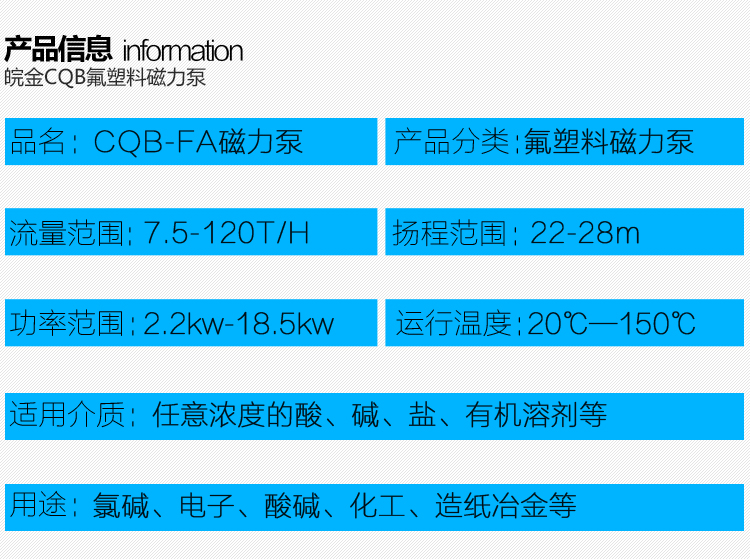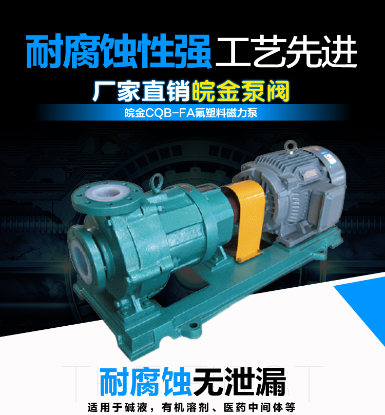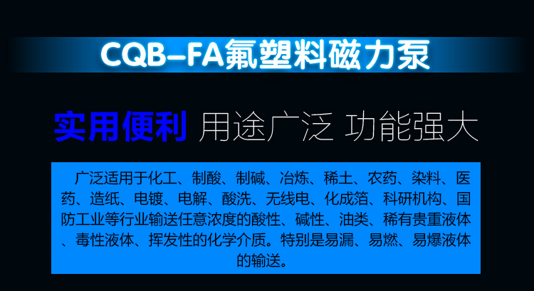 氟塑料磁力泵又稱其為氟塑料磁力離心泵、襯四氟磁力泵、氟塑料磁力驅(qū)動(dòng)泵、耐腐蝕磁力化工泵,CQB-FJ襯氟磁力泵是我公司氟塑料磁力泵中的全新升級(jí)款型。氟塑料磁力泵另有:CQB-