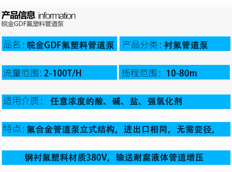 GDF氟塑料管道泵是耐腐蝕化工離心泵中的一種立式結(jié)構(gòu)形式的泵,安裝維護(hù)方便(維護(hù)葉輪、泵體、軸承時可以不拆除管道)、性能范圍廣、成熟等優(yōu)勢。耐腐蝕管道泵和耐酸堿管道泵,作為耐腐蝕泵中的氟塑料材質(zhì)泵在耐腐蝕性上的表現(xiàn),氟塑料管道泵以襯氟管道泵得到大多數(shù)工況企業(yè)的青睞。