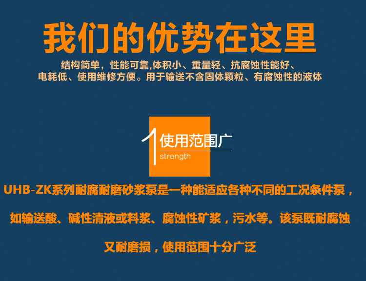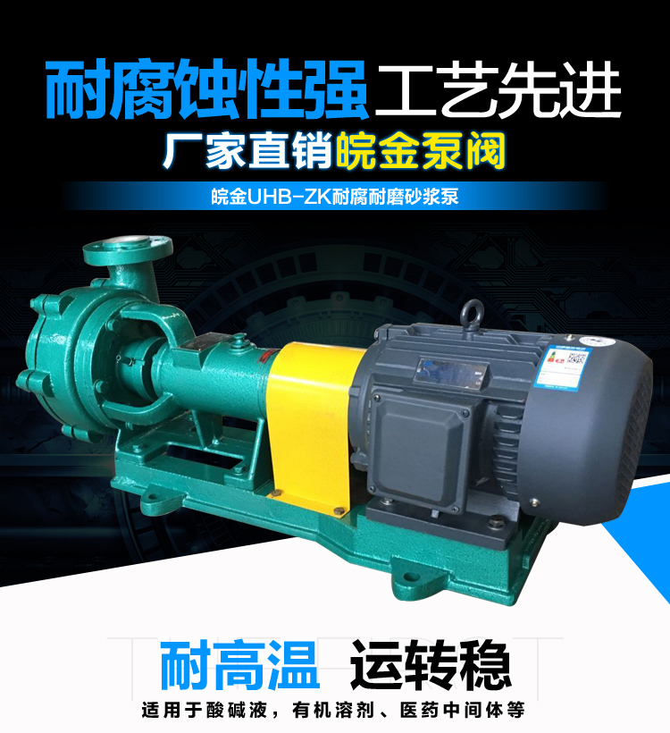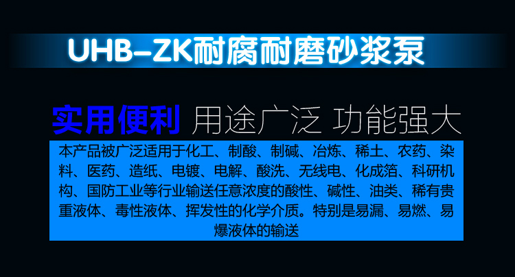 UHB-ZK耐腐耐磨砂漿泵能適應(yīng)各種不同的工況。如:既可以傳送酸、堿類清液或料漿,也可以輸送冶煉行業(yè)各種腐蝕性礦漿,還可以輸送硫酸行業(yè)各類稀酸、環(huán)保行業(yè)的各類污水等??奢斔蜐舛?0%以下的硫酸、50%以下的硝酸、鹽酸等積各類酸、堿、鹽的料漿,稀有金屬冶煉行業(yè)的各種腐蝕性砂漿及食品,酒類行業(yè)中的各類混合型介質(zhì)。該泵既耐腐蝕又耐磨損,使用范圍十分廣泛。