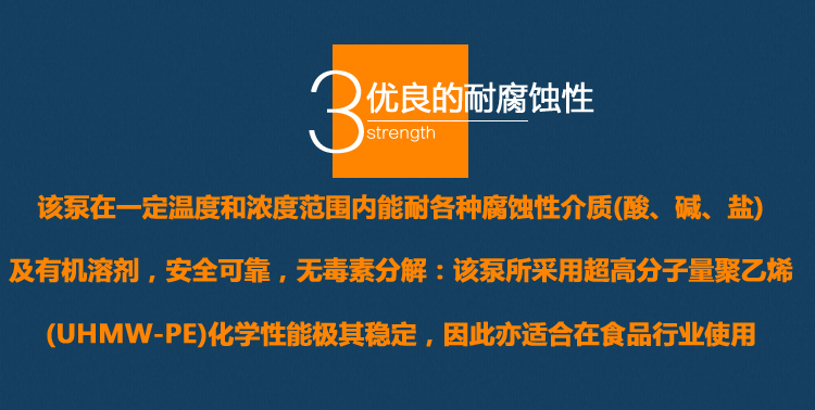 5、安全可靠,無毒素分解:該泵所采用超高分子量聚乙烯(UHMW-PE)化學(xué)性能極其穩(wěn)定,因此亦適合在食品行業(yè)使用。