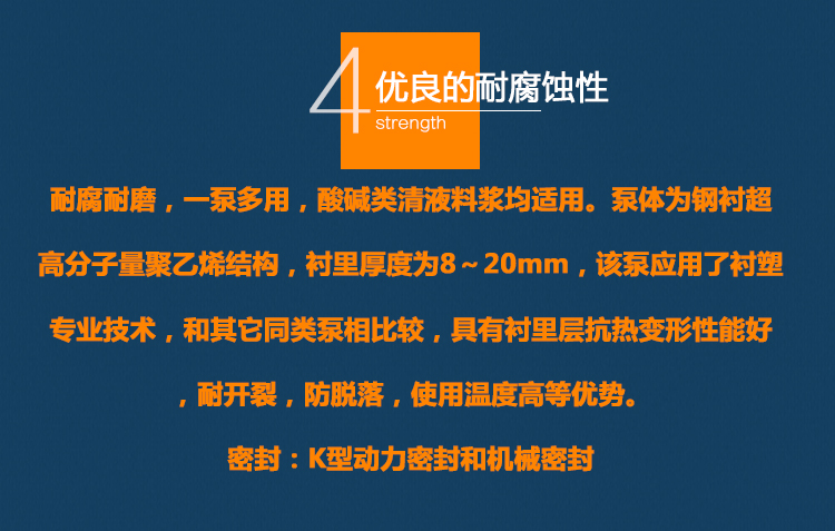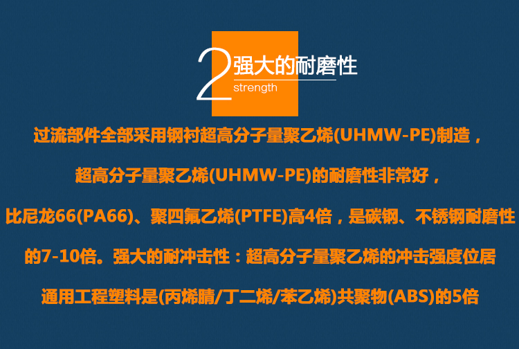 1、強(qiáng)大的耐磨性:過流部件全部采用鋼襯超高分子量聚乙烯(UHMW-PE)制造,超高分子量聚乙烯(UHMW-PE)的耐磨性,比尼龍66(PA66)、聚四氟乙烯(PTFE)高4倍,是碳鋼、不銹鋼耐磨性的7-10倍。