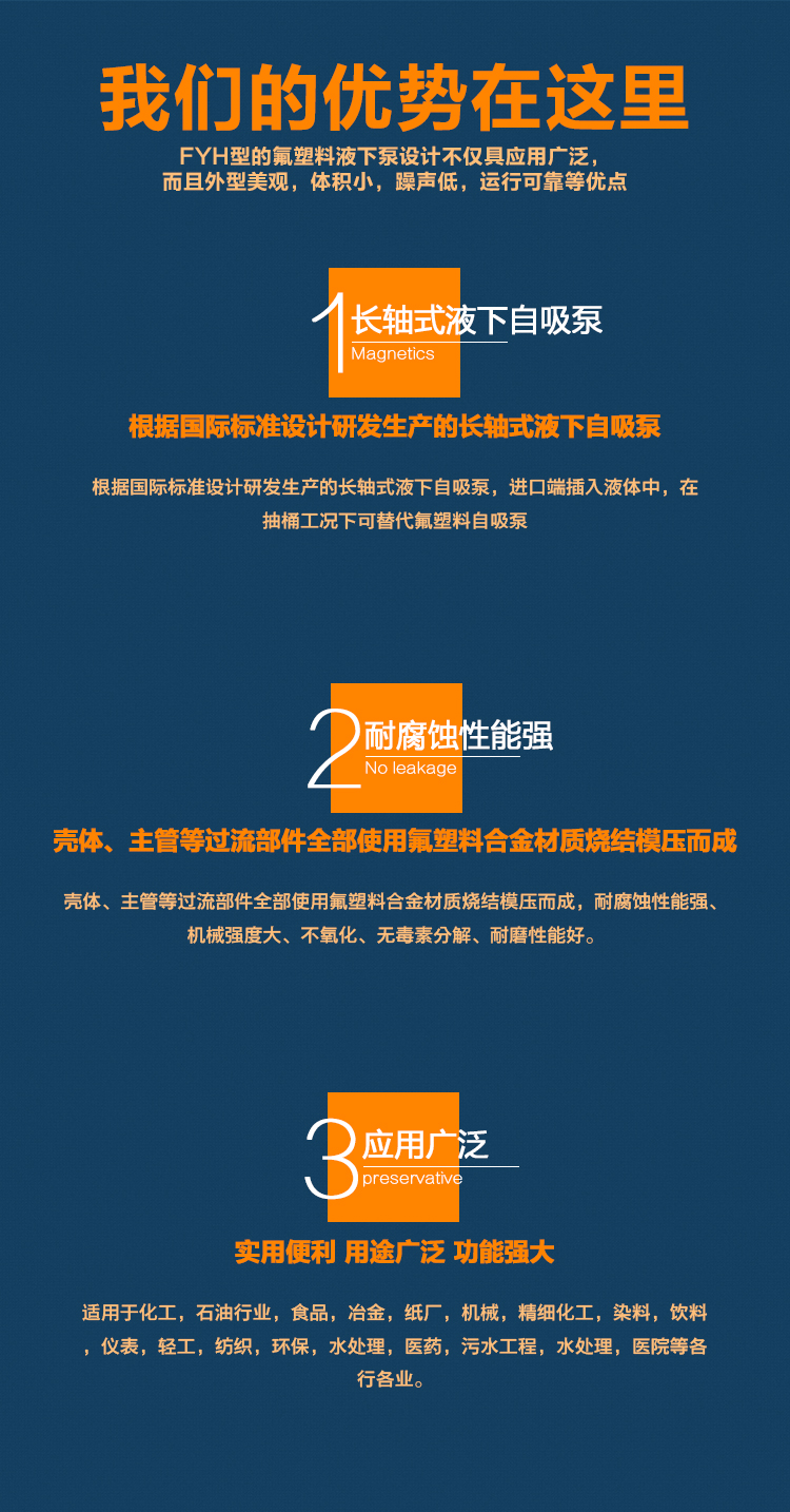 FYH氟塑料液下泵廣泛適用于:化工、制酸、制堿、冶煉、稀土、農(nóng)藥、染料、造紙、電鍍、酸洗、無線電、化成箔等行業(yè)輸送酸、堿、有機溶劑、強氧化劑等腐蝕性介質(zhì)。